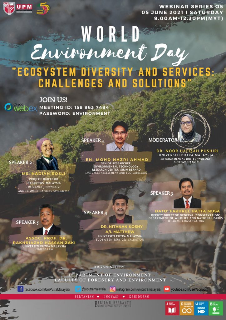 Speaker in the webinar series ‘World Environment Day: Ecosystem Diversity and Services – Challenges and Solutions’ organised by Department of Environment,  Faculty of Forestry & Environment (FHAS), Universiti Putra Malaysia (2021).